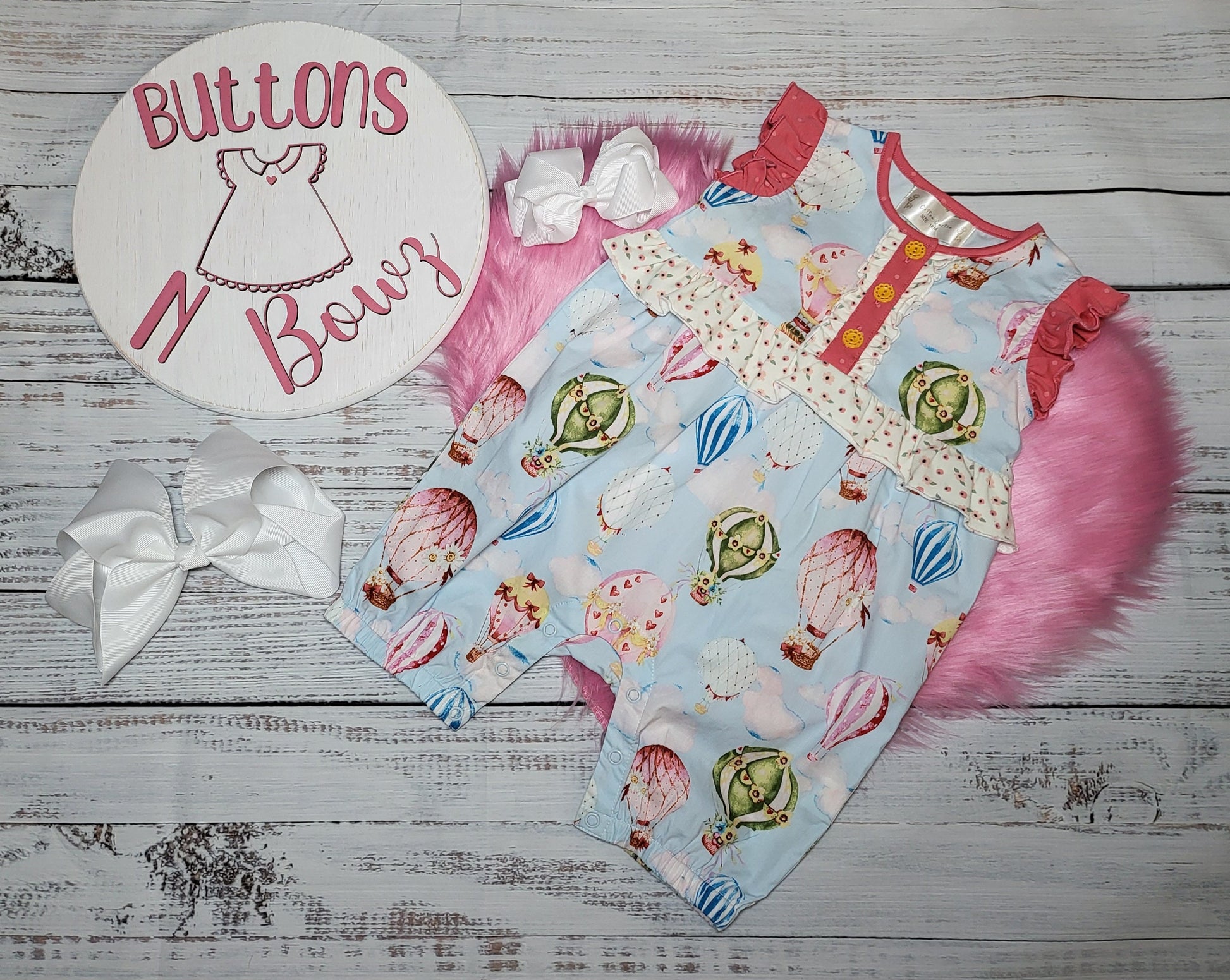 Beautiful Hot Air Balloon Romper with elegant ruffled details . With it's charm and beautiful details your baby will shine at any event.