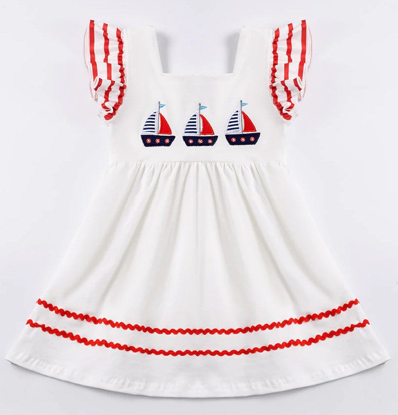 The absolute Perfect nautical-style dress. This whimsical sailing boat applique and ruffled dress is sure to be a hit. A perfect outfit for any sunny day.